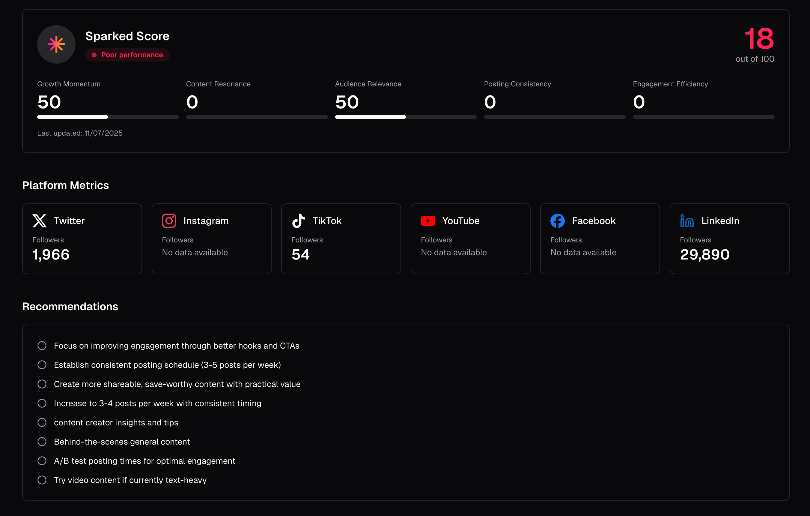 Home Dashboard - New dashboard showing your Sparked score, platform metrics, personalized recommendations, and quick actions for common tasks